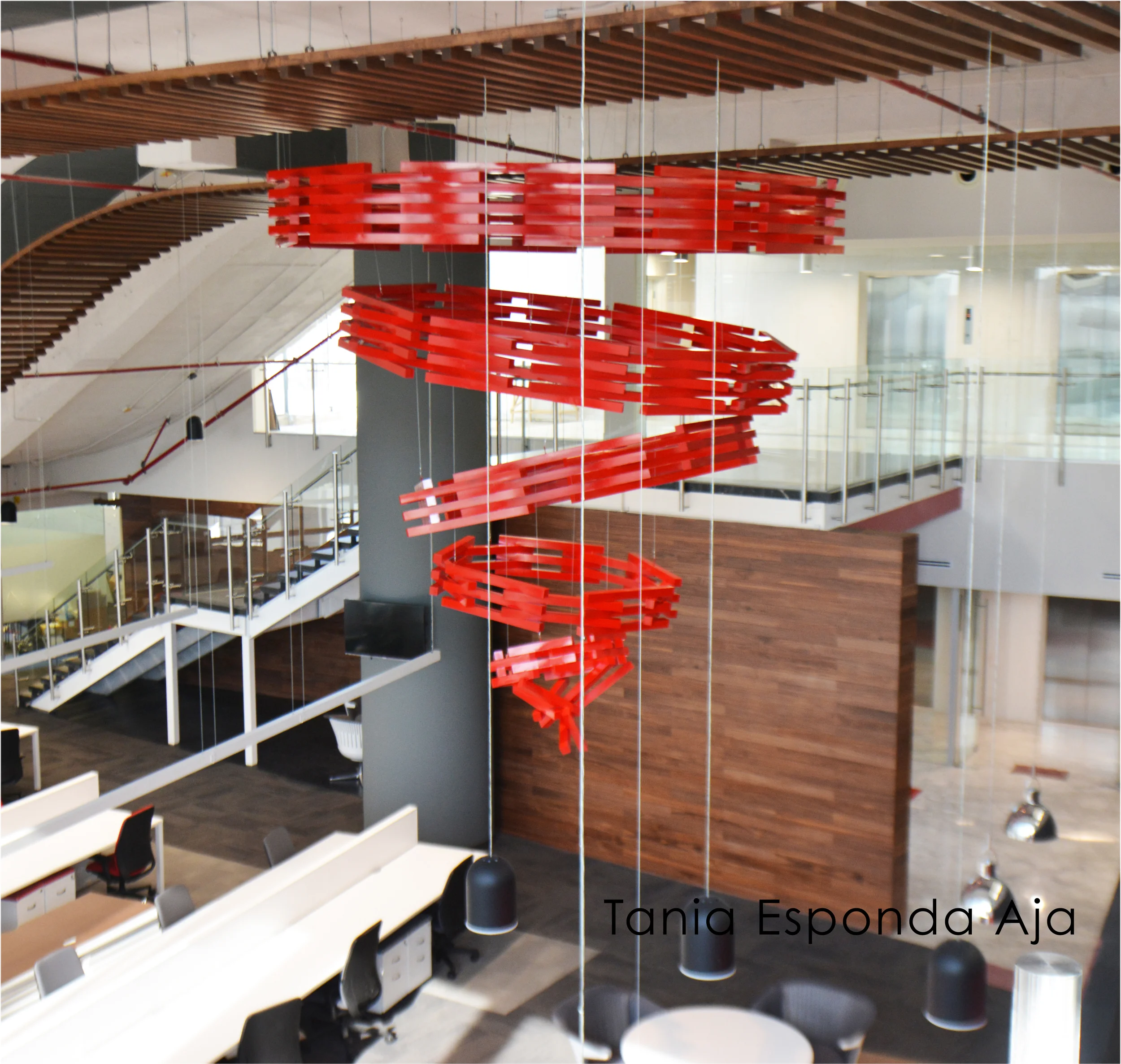 Red abstract sculpture made of interlocking rings on a black pedestal.