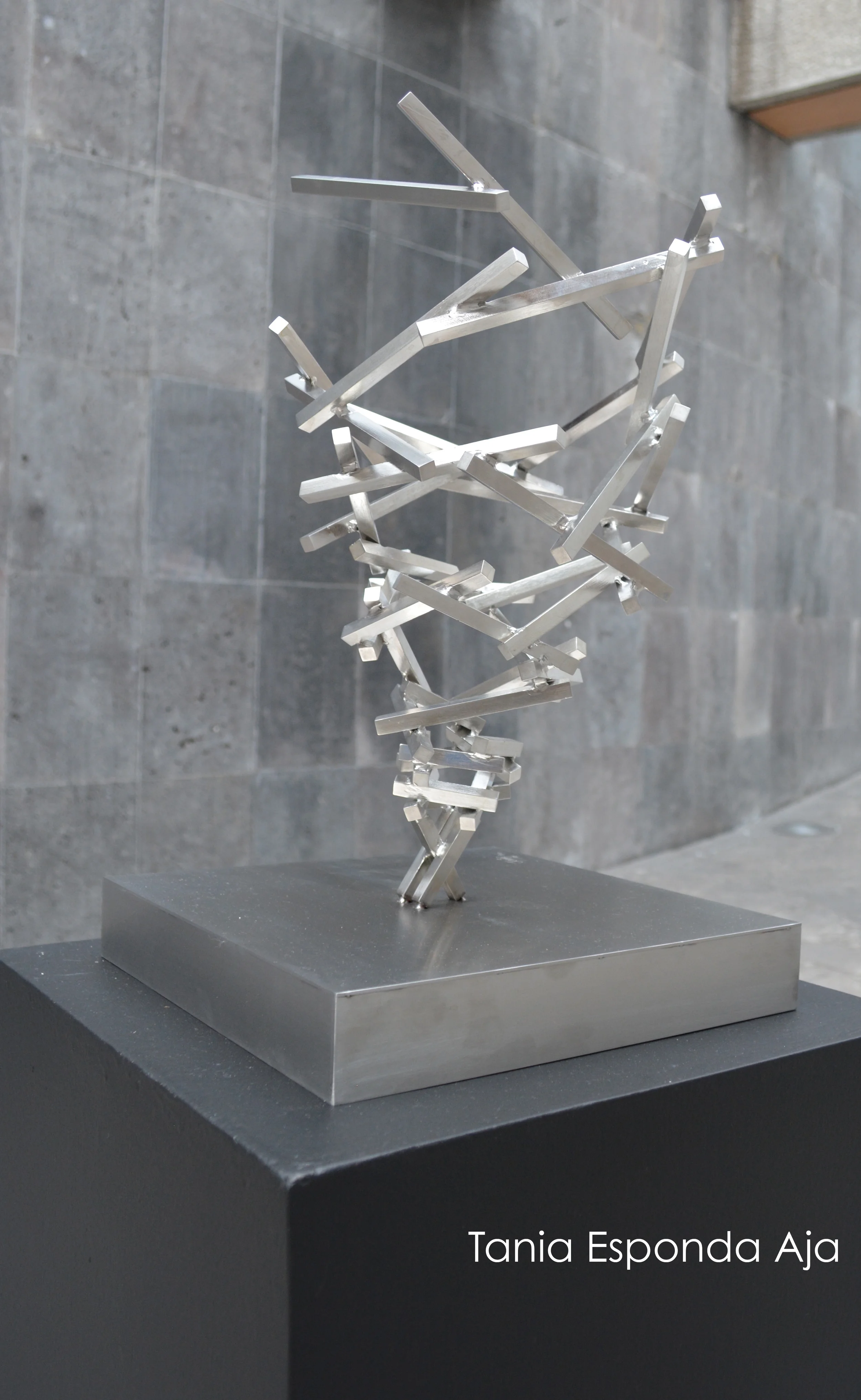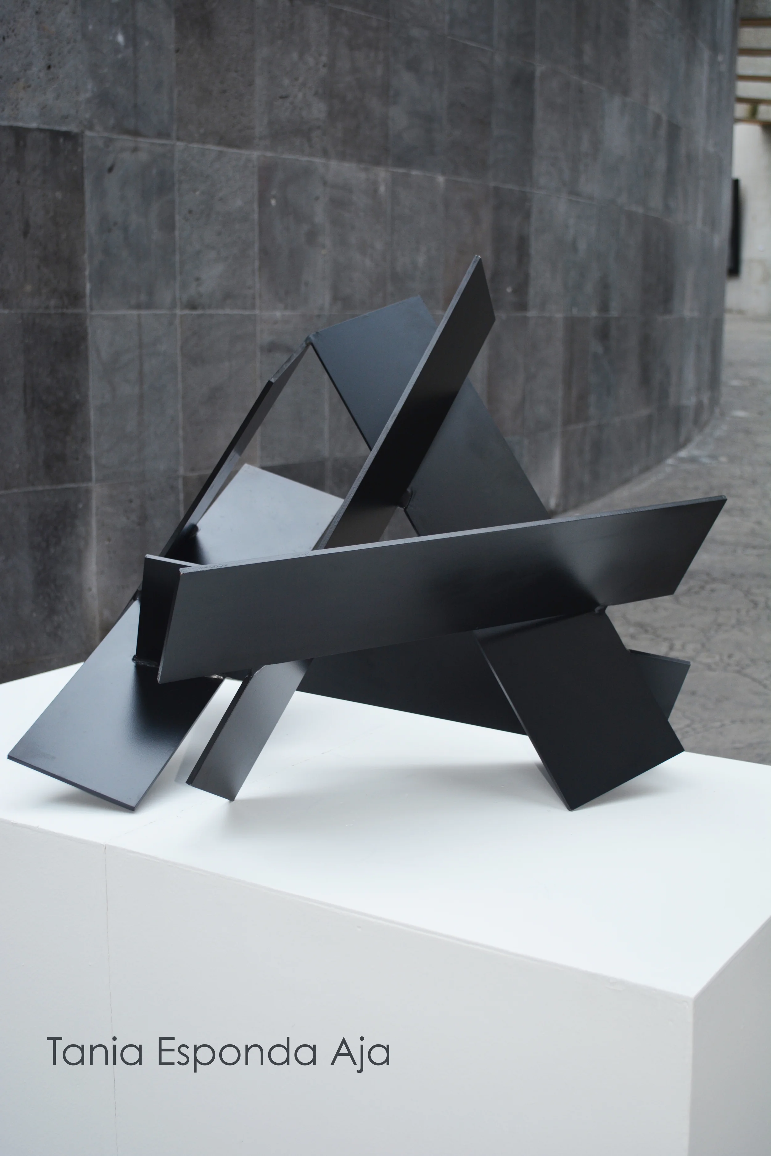 Stacked metal and black rings sculpture