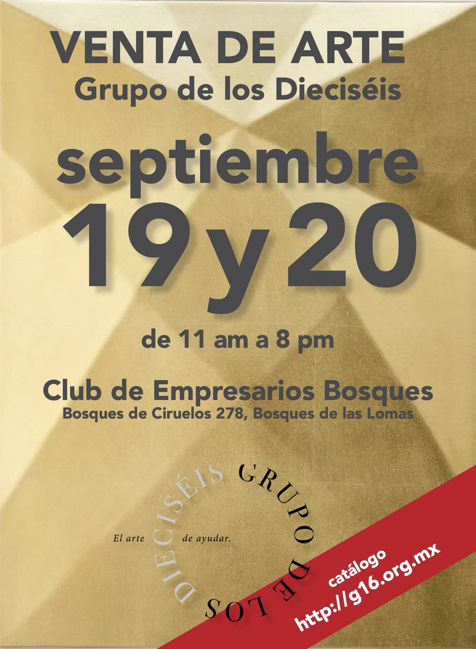 Poster for "Venta de Arte" event by Grupo de los Dieciséis on September 19 and 20 at Club de Empresarios Bosques, Bosques de Ciruelos 278, Bosques de las Lomas, from 11 am to 8 pm.