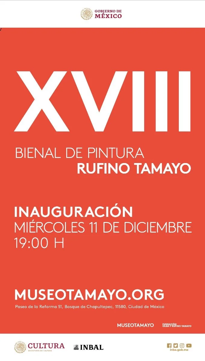 Poster for the XVIII Rufino Tamayo Painting Biennial, opening on December 11 at 7:00 PM at Museo Tamayo in Mexico City.