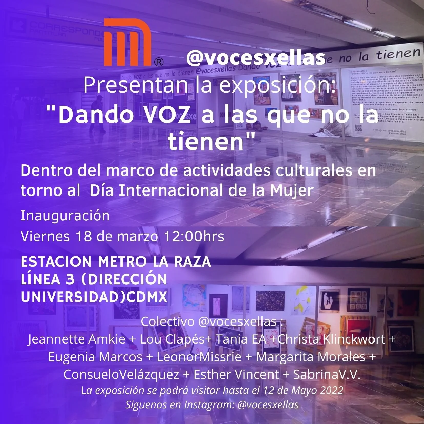 Poster for an art exhibition at Estación Metro La Raza, Mexico City, titled 'Dando VOZ a las que no la tienen,' held from March 18 to May 12, 2022. Organized by colectivo @vocesxellas in celebration of International Women's Day. Lists participating a