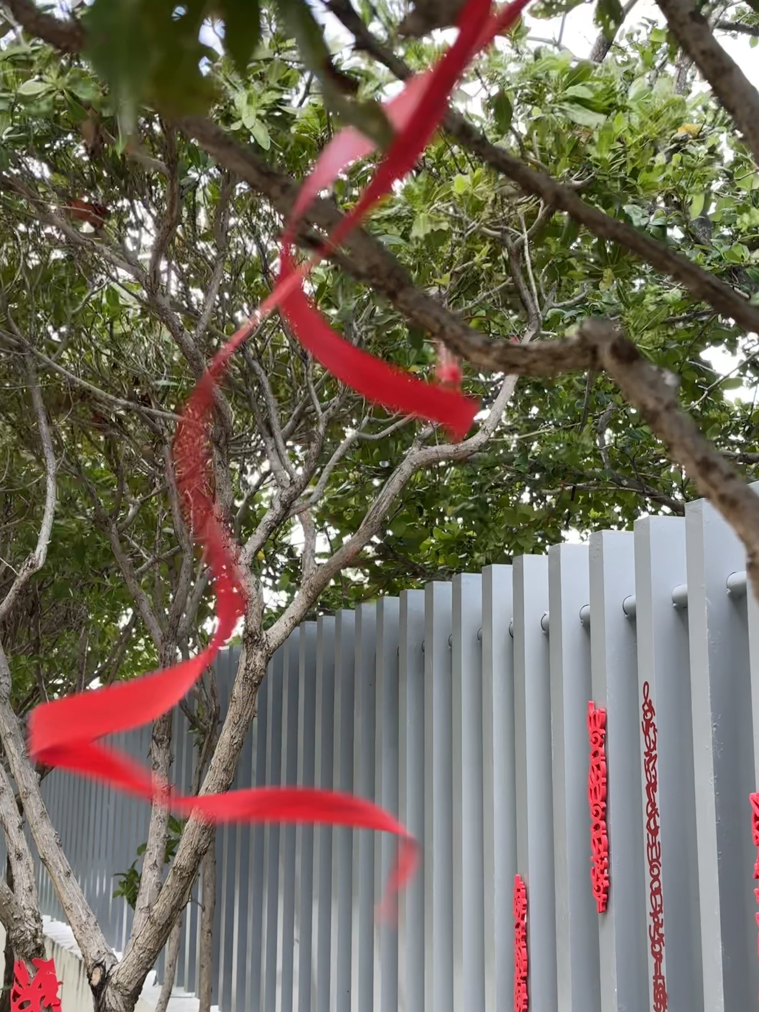 The "Wishing Trees" segment of this installation paints a beautiful tapestry of cultural significance. Hanging from every branch, vibrant red ribbons (that will be repurposed) carry heartfelt messages with the words "Love," "Hope," "Joy," "Beauty," and "Inspire" inscribed upon them with the artist's message of kindness. This tradition of adorning trees with red ribbons resonates globally, embodying diverse meanings. In some cultures, these ribbons serve as hopeful pleas, transforming the trees into wishing trees where dreams take flight. For others, they symbolize prayers to saints or acts of seeking good fortune and in Kabbalah, red ribbons act as a protection against evil eye. This kaleidoscope of intentions enriches the understanding of the words written on the ribbons, infusing them with the depth of human aspiration, reverence, and interconnectedness across cultures and time.